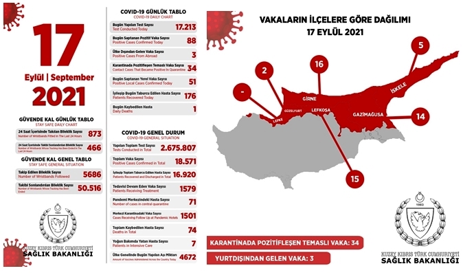 3 kişi yurt dışından gelmiştir. 34 kişi daha önce tespit edilen vakaların temaslılarıdır ve bu süre içinde gözetim altında bulunmaktadırlar. 51 kişi ise yerel vakadır.15 kişi Lefkoşa, 16 kişi Girne, 14 kişi Gazimağusa, 5 kişi İskele, 2 kişi Güzelyurt, Bölgesi’ndendir.17 Eylül 2021 Covid-19 genel durumu şöyle;Bugün Yapılan Test Sayısı: 17.213Bugün Saptanan Pozitif Vaka Sayısı: 88Ülke dışından gelen Vaka Sayısı : 3Karantinada Pozitifleşen Temaslı Vaka Sayısı: 34Yerel Vaka Sayısı: 51İyileşip Bugün Taburcu Edilen Hasta Sayısı: 176Bugün Kaybedilen Hasta: 1Yapılan Toplam Test Sayısı: 2 .675.807Toplam Vaka Sayısı: 18.571İyileşip Toplam Taburcu Edilen Vaka Sayısı: 16.920Tedavisi Devam Eden Vaka Sayısı: 1579Pandemi Merkezindeki Hasta Sayısı: 71Merkezi Karantinadaki Vaka Sayısı : 1501Toplam Kaybedilen Hasta Sayısı: 74Yoğun Bakımda Yatan Hasta Sayısı: 7Ülke Genelinde Bugün Yapılan Aşı Miktarı : 4672Güvende Kal uygulamasına bağlı güncel rakamlarSon 24 Saat İçerisinde Takılan Bileklik Sayısı: 873Son 24 Saat İçerisinde Takibi Sonlandırılan Bileklik Sayısı: 466Güvende Kal Genel tabloTakip Edilen Toplam Bileklik Sayısı: 5686Takibi Sonlandırılan Toplam Bileklik Sayısı: 50.516
