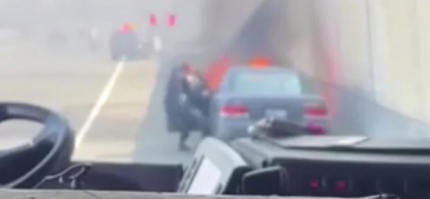 İtfaiye aracındaki kamera tarafından kaydedilen görüntülerde, bir polis memurunun yanan otomobilin sürücü koltuğundaki kişiyi çıkarıp sürükleyerek araçtan uzaklaştırdığı görüldü.
