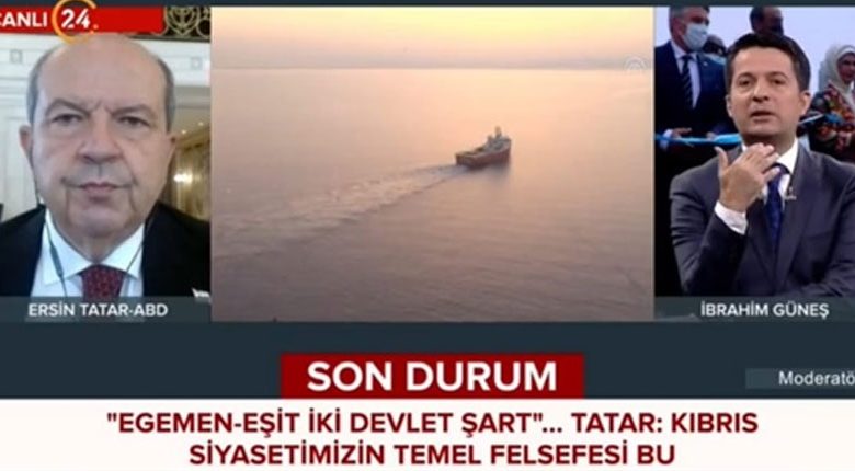 24 TV’nin canlı yayınına katılarak, Kıbrıs Türk halkının asırlardır mücadele verdiğini anlatan Cumhurbaşkanı Ersin Tatar; Kurucu Cumhurbaşkanı Rauf Raif Denktaş’ın kaldığı otelde, o yıllarda mücadele eden arkadaşlarıyla kendisini yad ettiğini söyleyerek, Denktaş’ın orada bıkmadan usanmadan bağımsızlıktan, özgürlükten, egemenlikten bahsettiğini; Türkiye’nin 1974’ten sonra Kıbrıs’a gelebildiğini ve o gün kurtulup, o gün özgürlüğe ve bağımsızlığımıza kavuşulduğunu anlattığını söyledi.Cumhurbaşkanlığından verilen bilgiye göre, BM Genel Kurulu’nda Rum lider Nikos Anastasiadis’in kürsüye çıktığını, tek taraflı ve tamamen Türkiye’yi suçlayacak şekilde bir konuşma yaptığını belirten Cumhurbaşkanı Tatar şöyle dedi:“Benim Cumhurbaşkanı seçilmemi, Türkiye’nin müdahalesiyle ortaya çıkmış bir başarı olarak tarif etti. Yani Sayın Akıncı kalsaydı, Kıbrıs meselesini çözecekti. Tamamen yalana dayalı, tarihi gerçekleri çarpıtan, doğrularla alakası olmayan bir konuşma yaptı. Zihniyet bu. Biz büyük bir sabırla bu mücadeleyi yürütmekteyiz. Hamdolsun Türkiye’ye. Cumhurbaşkanı Recep Tayyip Erdoğan, Dışişleri Bakanı Mevlüt Çavuşoğlu ve tüm yetkililer beni burada fevkalade güzel ağırladı. Türk Evi’nin açılması için benim orada olmam, Cumhurbaşkanı Recep Tayyip Erdoğan’ın çeşitli sebeplerle beni diğer devlet başkanlarıyla tanıştırması ve o kurdele kesiminde orada benim de durabilmem gurur vericidir.”Sosyal medya hesabından, Özgürlük Heykeli’nin önünde “Egemen eşitlikten vazgeçilmez” yazılı bir gönderi paylaştığı hatırlatılıp bunun sorulması üzerine ise Cumhurbaşkanı Tatar şunları ifade etti:“Biz şu anda Cenevre’de 27-29 Nisan tarihlerinde yaptığım sunumda da ilk kez söylediğim gibi, ki bunu Cumhurbaşkanı Recep Tayyip Erdoğan bir dönüm noktası olarak nitelendirmiştir;egemen eşitlik ve uluslararası eşit statü talep ediyoruz. Aksi takdirde resmi müzakerelere geçmeyeceğiz. Bu da bizim değerlendirmemiz. 1960 anlaşmalarında Kıbrıs’ın iki kurucu ortağı olan Kıbrıslı Türkler, en az Rumlar kadar egemendir, meşrudur. Dünyanın Kıbrıs’a baktığında gördüğü şudur; Birleşmiş Milletlerde konuşan Rum liderdir. Bana söz hakkı verilmiyor. O güya Kıbrıs Cumhuriyeti adına konuşuyor, bütün Kıbrıs’ın yöneticisiymiş gibi bir algı oluşturuyor. Böyle bir şey yoktur. Kıbrıs’ta iki ayrı halk vardır. Güneydeki Rum Cumhuriyeti; kuzeydeki de Kıbrıslı Türklerin devletidir. Biz 1963’ten beri kendi devletimizi yönetiyoruz. Kendi halkımızı birlik ve beraberlik içinde bugünlere hazırladık. KKTC olarak egemen bir devlet olarak Kıbrıs’ın kuzeyinde varlığımızı sürdürüyoruz. Artık dünyaya diyoruz ki biz ortaklık ve tek egemenlik, özellikle Avrupa Birliği’nde olacak olan bu yapının bizim için çözüm olamayacağıdır. Çünkü Türkiye, AB üyesi değildir. Bütün oynanan oyunların sonucu olarak çoğunluğun azınlığı yöneteceği, Kıbrıs Türk halkı ile Türkiye’nin bağlarının kopartılacağı, Doğu Akdeniz’deki Mavi Vatan ve milli çıkarlarımızın pekiştiği konularda Türkiye’nin dışlanmasıyla bir zafiyet oluşturma çabası içindedirler. Biz bu oyuna gelmeyiz. Biz Kıbrıs’ta iki ayrı eşit halkın egemen olarak yan yana yaşayan iki devletin iş birliği ile bir anlaşmanın olabileceğini söylüyoruz. Biz de anlaşma istiyoruz ama eşitlik temelinde ve devlet temelinde. Bu yeni siyasetin temel felsefesi budur.”“TÜRK ASKERİ BARIŞIN TEMİNATIDIR”Cumhurbaşkanı Ersin Tatar’ın seçilmesinin, Rum kesiminde hayal kırıklığı yarattığını, CHP’den bazı isimlerin Mavi Vatan doktrininin bir saldırganlık ve bunun da Türkiye’nin askeri güç anlamında kışkırtması olduğunu söylemelerini ve Türkiye’nin KKTC’ye verdiği desteği nasıl değerlendirdiğinin sorulması üzerine Cumhurbaşkanı Ersin Tatar, “Yaptığımız bütün değerlendirmelerde Mavi Vatan’ın ne kadar önemli olduğunu gördük. Türkiye Doğu Akdeniz’e çanağı olan, çok yakın bir coğrafya. Tabii ki bizim için de çok önemlidir. Türkiye’nin yanımızda olması da çok önemlidir. Farklı değerlendirmeleri yapanların tekrar düşünmesi lâzım. Oluşan pozisyon, bizim Mavi Vatan’da haklı iddialarımızın yer bulmasıdır” dedi.Yunanistan Savunma Bakanı Nikolaos Panagiotopulos’un, özellikle Doğu Akdeniz mücadelesi ve Mavi Vatan meselesi olarak Türkiye’yi kışkırtıcı davranmakla suçlaması ve bu yaklaşımların Atina cephesinden gelmesini şaşkınlıkla izlediğini belirten Cumhurbaşkanı Tatar, 9 Eylül’de İzmir’de, TC Milli Savunma Bakanı Hulusi Akar’la yaptığı değerlendirmelerde Ege’de yaşananların apaçık belli olduğunu, bunun kabul edilmesinin mümkün olmadığını, hem hukuka hem anlaşmalara aykırı olduğunu, Türkiye’nin ana kıta olarak bölgedeki hakimiyeti yanı başındaki adaların yetki alanını istismar etmek suretiyle Türkiye’nin açık denizlere hareket kabiliyetini sınırlamaya çalıştıklarını kaydetti. Bunun kabul edilemez olduğunu kaydeden Tatar, Türkiye’nin gücünün, duruşunun ve Doğu Akdeniz’deki hakimiyetinin belli olduğunu dile getirdi.Türkiye’nin KKTC halkını garantör ülke olarak desteklemesi, Türk Silahlı Kuvvetleri’nin Kıbrıs’ta temsil edilmesinin güvenlik için çok önemli olduğunu söyleyen Cumhurbaşkanı Tatar şöyle devam etti:“Biz 1974’ten önce çok acılar çektik. Asker gelene kadar soykırım yaşadık, her türlü zulmü işkenceyi yaşadık bunları unutamayız. Kıbrıs Türk halkı olarak asla 1974 öncesine dönmeyiz. Buna izin vermeyiz. Oynanan oyun tamamen hukuksuzdur. Bu oyunlar geride kalmıştır. O yüzden KKTC güçlendirilmelidir. Kıbr