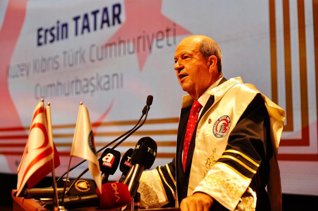 Cumhurbaşkanı Ersin Tatar, kendisine fahri doktora verilmesinden duyduğu gururu ve mutluluğu dile getirerek başladığı konuşmasında, Çanakkale şehitlerini andı, Kıbrıs Türk halkının selamlarını iletti, Türkiye Cumhuriyeti’nin 100. yıl dönümünü kutladı ve yeni yüzyılın başarılarla geçmesini temenni etti.