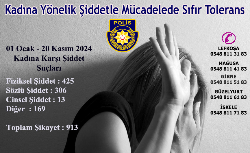 “25 Kasım, kadına yönelik şiddete karşı dikkat çekmek ve farkındalık oluşturmak amacıyla 1999 yılında Birleşmiş Milletler Genel Kurulu kararı ile ‘Kadına Yönelik Şiddete Karşı Uluslararası Mücadele Günü’ olarak ilan edilmiştir. Polis Genel Müdürlüğü olarak yılda sadece bir gün değil yılın her günü, başta kadına yönelik şiddet olmak üzere her alanda meydana gelen şiddet konusunda sıfır tolerans ilkesi ile hareket etmekteyiz. Kadına yönelik şiddet suçlarına daha hızlı müdahale etmek, halkımıza kaliteli ve etkili hizmet sağlayabilmek maksadıyla, 2018 yılında sadece Lefkoşa Polis Müdürlüğü’nde hayata geçirilen ‘Kadına Karşı Şiddete Müdahale Şubesi’, 2021 yılında Polis Genel Müdürlüğü ile tüm İlçe Polis Müdürlükleri’nde de faaliyete geçirilerek ülke geneline yayılmıştır. Kadına yönelik şiddet konusunda gelecek şikayet ve başvuruları anında değerlendirerek müdahale etmek maksadıyla, her zaman olduğu ‘155 Polis İmdat’ hattı ve Lefkoşa’da 0548 811 31 83, Gazimağusa’da 0548 811 41 83, Girne’de 0548 811 51 83, Güzelyurt’ta 0548 811 61 83 ve İskele’de 0548 811 71 83 çağrı numaralı hatlarımız ile 7/24 halkımızın hizmetinde olduğumuzu hatırlatırız. Kadına yönelik şiddet konularında, Polis Genel Müdürlüğü’ne 2024 yılı içerisinde yapılan tüm şikayet ve başvurular anında değerlendirilerek hassasiyetle soruşturulmuş ve her zaman olduğu gibi gerekli yasal işlemler süratle yapılmıştır.”