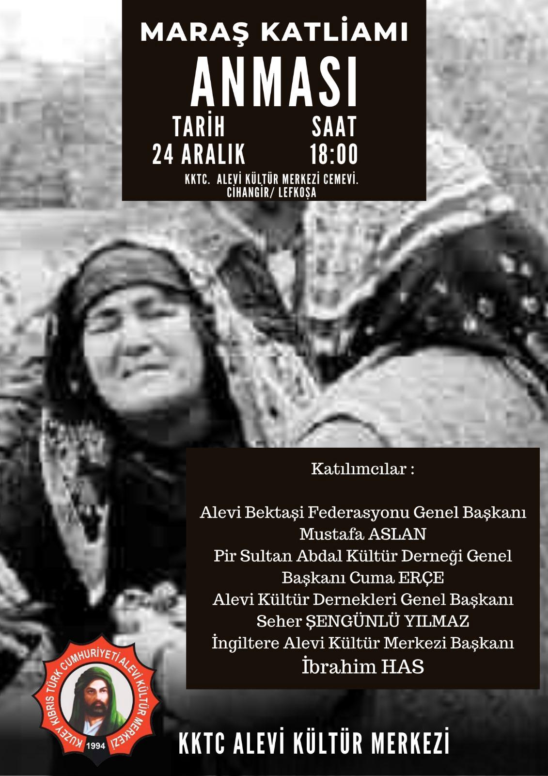 KKTC Alevi Kültür Merkezi, 1978 yılında Türkiye’nin Maraş şehrinde gerçekleşen ve tarihe “Maraş Katliamı” olarak geçen olayların 45. yıldönümünde yaşamını yitirenler için anma etkinliği düzenleyecek.