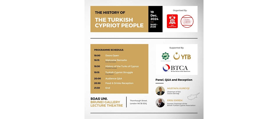 Kıbrıs tarihi konusunda bilgilendirici faaliyetler yürütme amacıyla kurulan Young Turkish Cypriots sivil toplum örgütü ve SOAS Türk Derneği, Londra’da “Kıbrıslı Türklerin Tarihi” konulu panel düzenliyor.