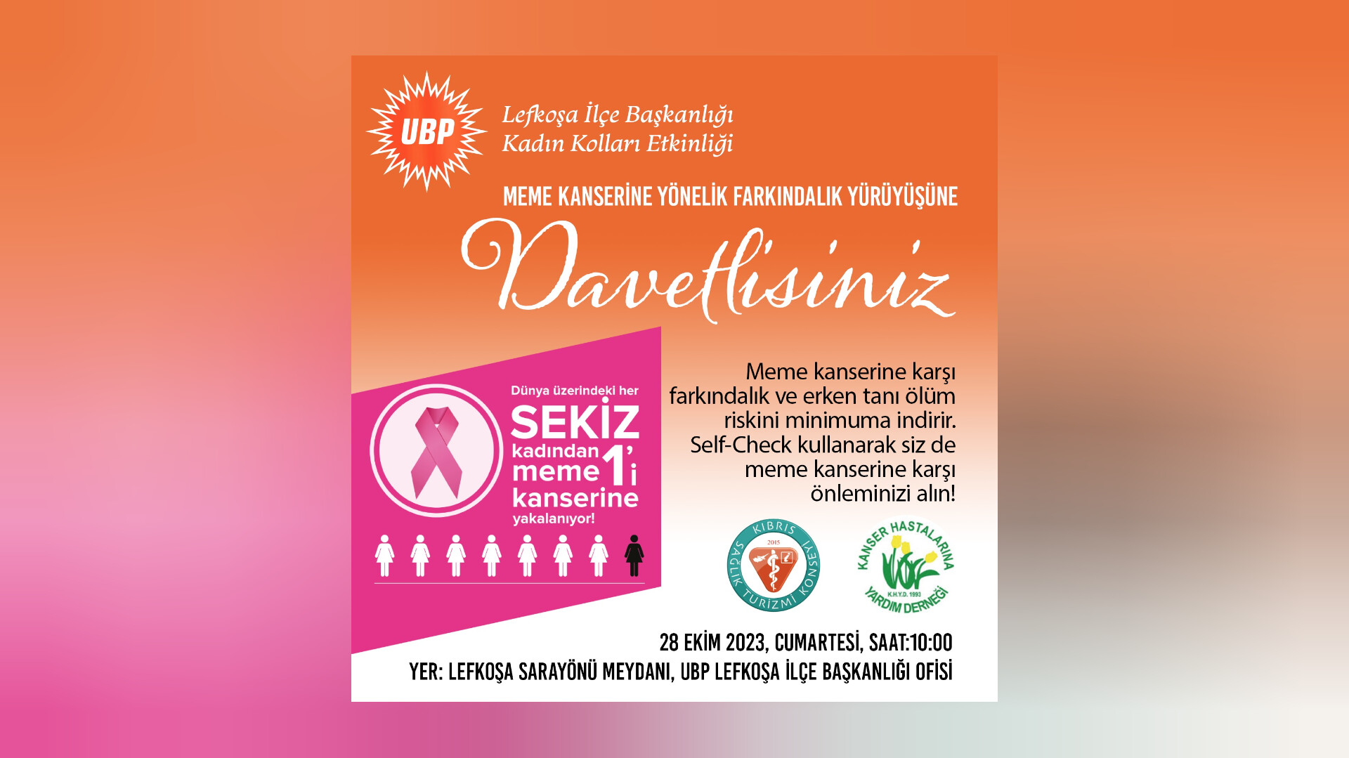 Ulusal Birlik Partisi (UBP) Genel Başkanı ve Başbakan Ünal Üstel’in Eşi Zerrin Üstel’in katılımı ile UBP Lefkoşa İlçesi Kadın Kolları, yarın meme kanserine karşı farkındalık yürüyüşü gerçekleştiriecek.